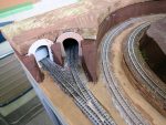 ・トンネルポータルのカーブ部分でNナローの客車が当たっていたのを、少し開口部を広げたものに置き換えて調整しました。橋の手すり部分が当たる問題は未解決ですが、通過できないほどではないので、とりあえずそのままです。