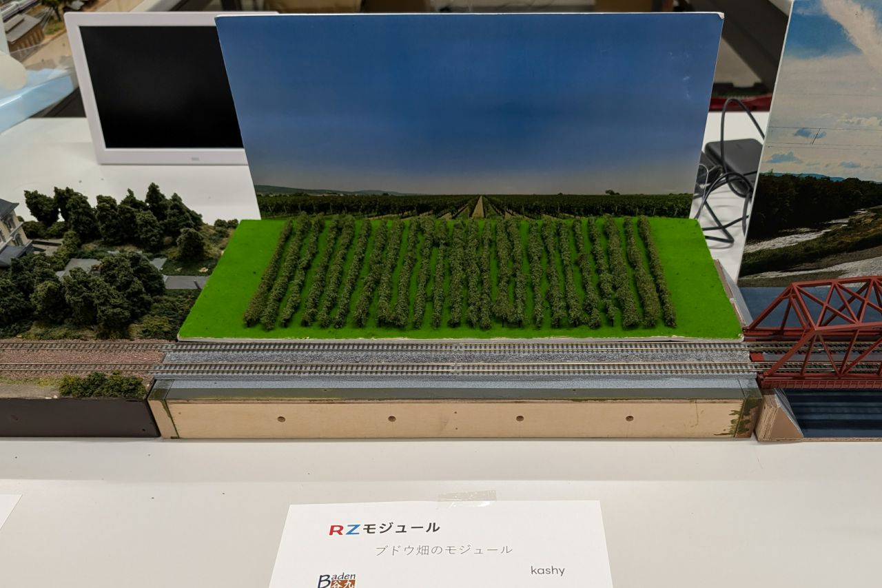 今回は10名の会員が思い思いの情景で制作した、総延長8m以上におよぶ20台のモジュールを繋いで展示運転を行いました。
